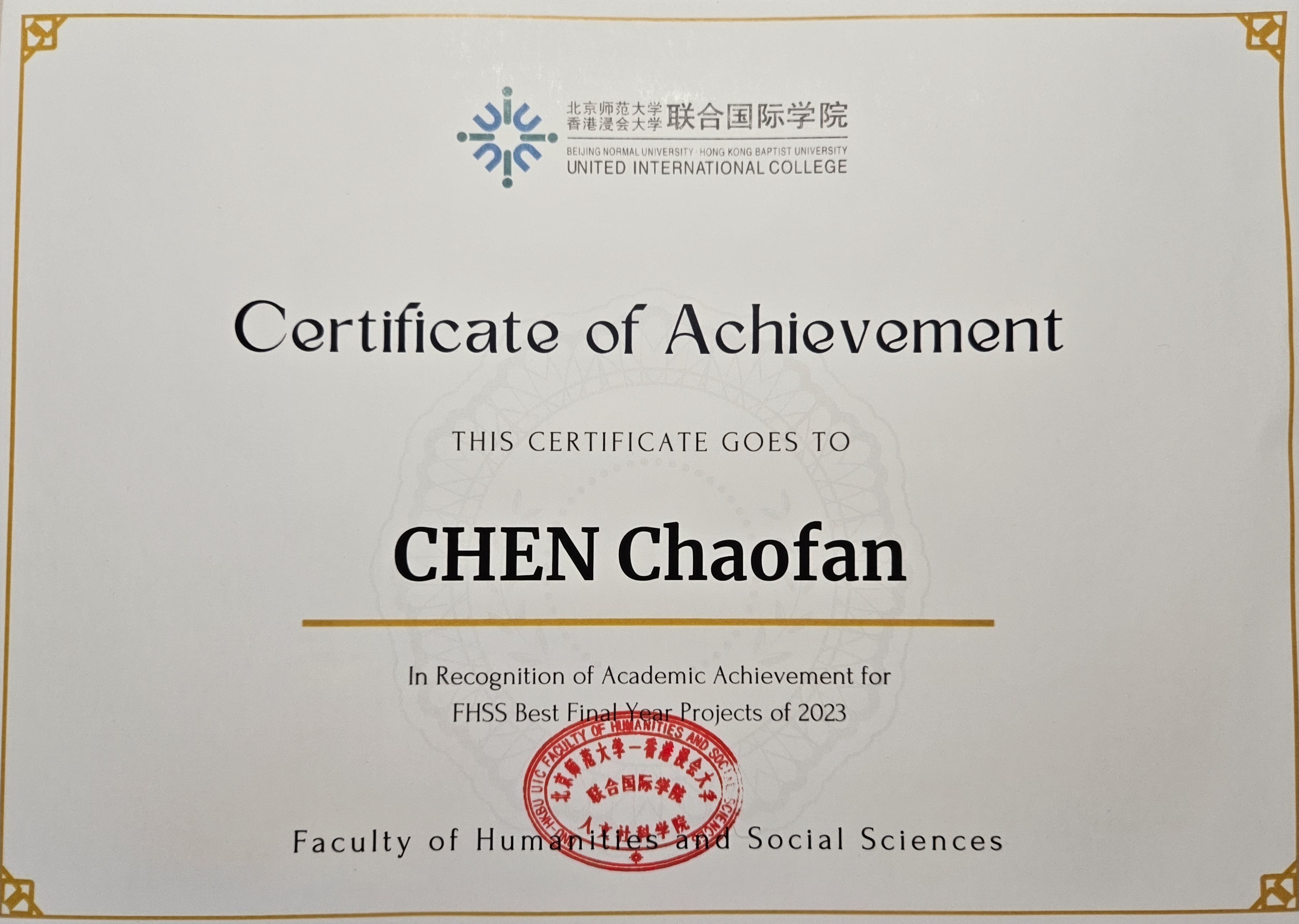 The award ceremony was held on the campus of BNU-HKBU United International College, where Chen was presented with an award certificate and souvenir from the Head and Associate Head of the Department of Social Sciences.