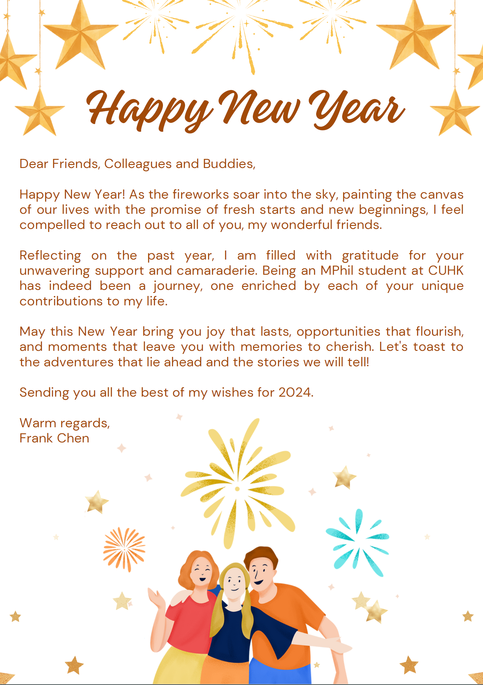 回首过去一年,我由衷感谢你们给予的坚定支持与深厚友情。在2023年,我完成了本科学业并荣幸地加入香港中文大学政治与公共行政系,攻读哲学硕士学位。这是一段意义非凡、充满挑战的新旅程。你们每个人对我的生活所做出的特别贡献,使这段经历更加丰富多彩。