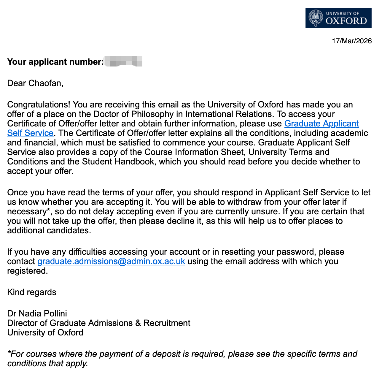 I am thrilled to share that I have received an admission offer from the University of Oxford for the DPhil (Doctor of Philosophy) in International Relations under the Department of Politics and International Relations (DPIR).